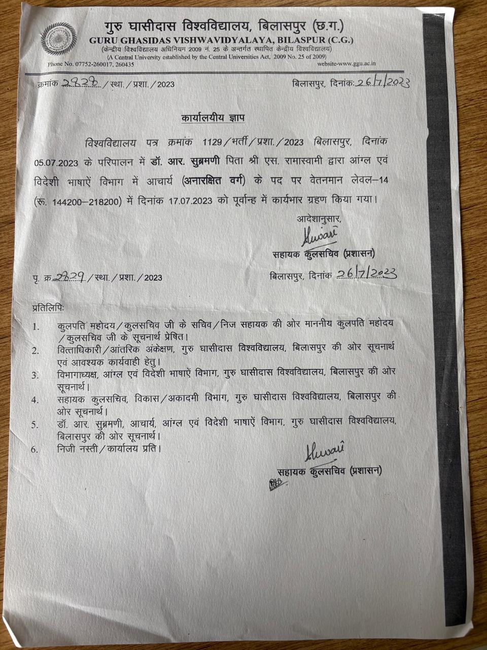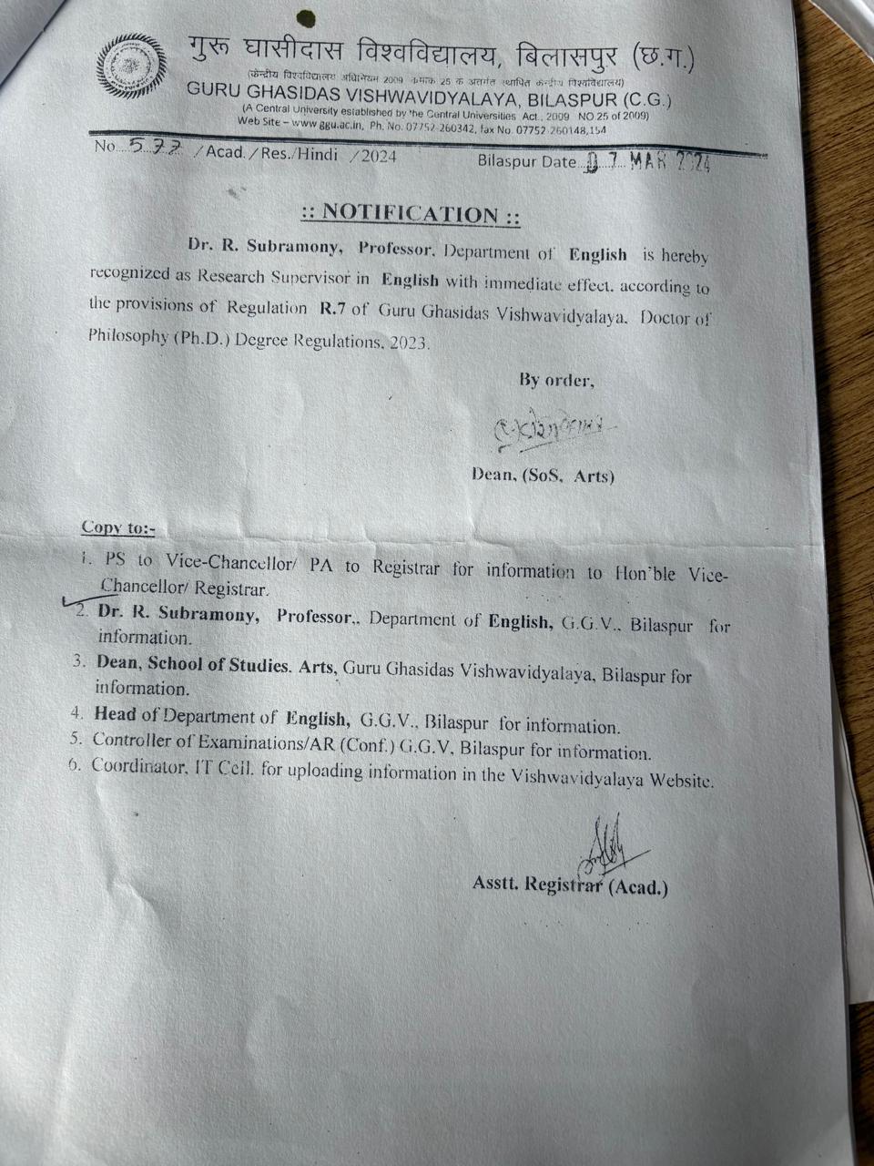 Notification of Research Guide of Prof Ramaswami Subramoni