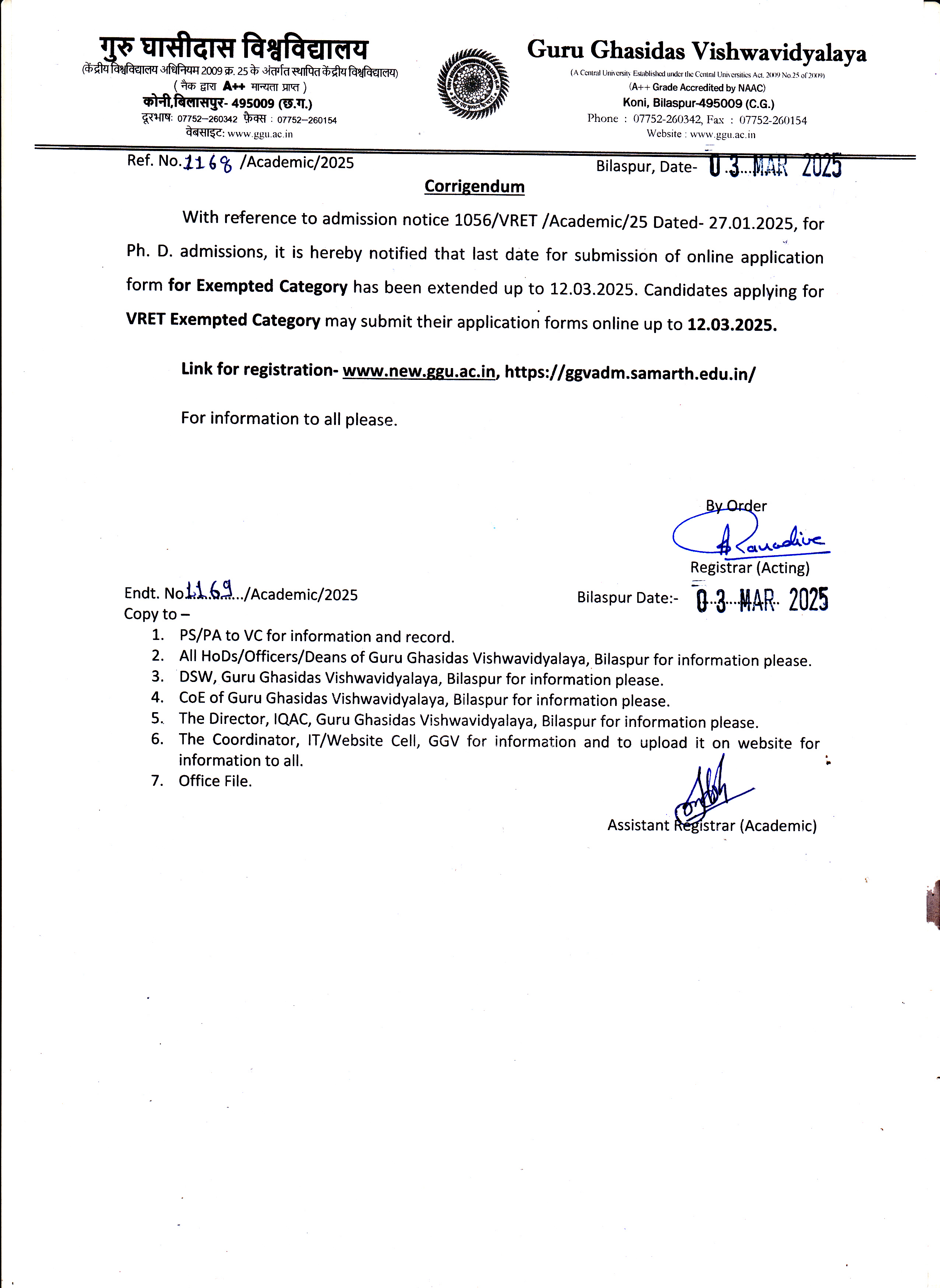 ऑनलाइन आवेदन के लिए URL (वी.आर.ई.टी. 2024-25) - https://ggvadm.samarth.edu.in/