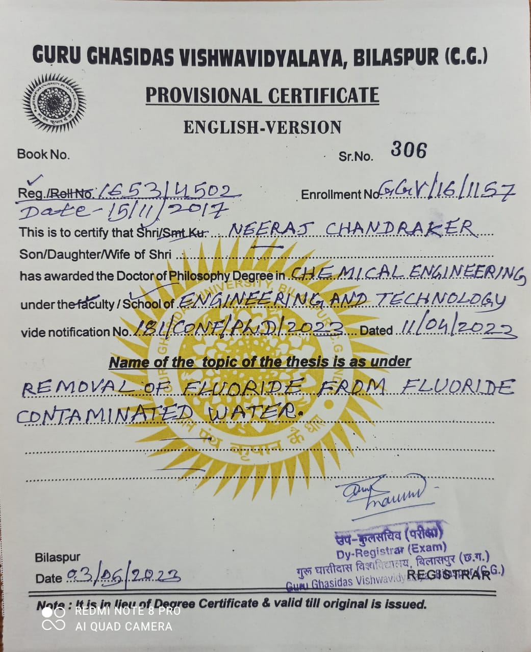 PhD degree of Dr. Pankaj Kumar