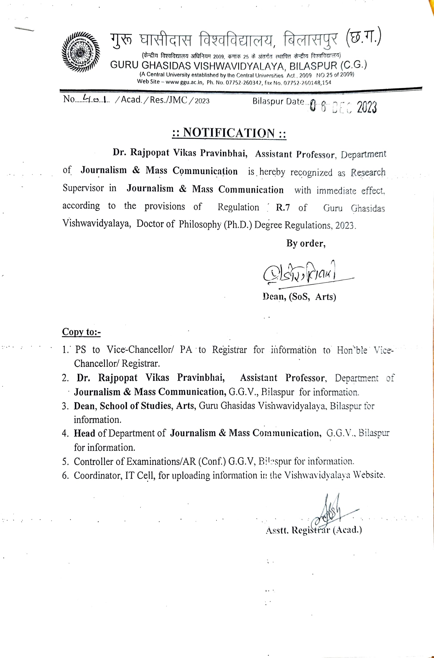 Notification regarding Research Supervisor Dr. Vikas Rajpopat for Department of Journalism and Mass Communication