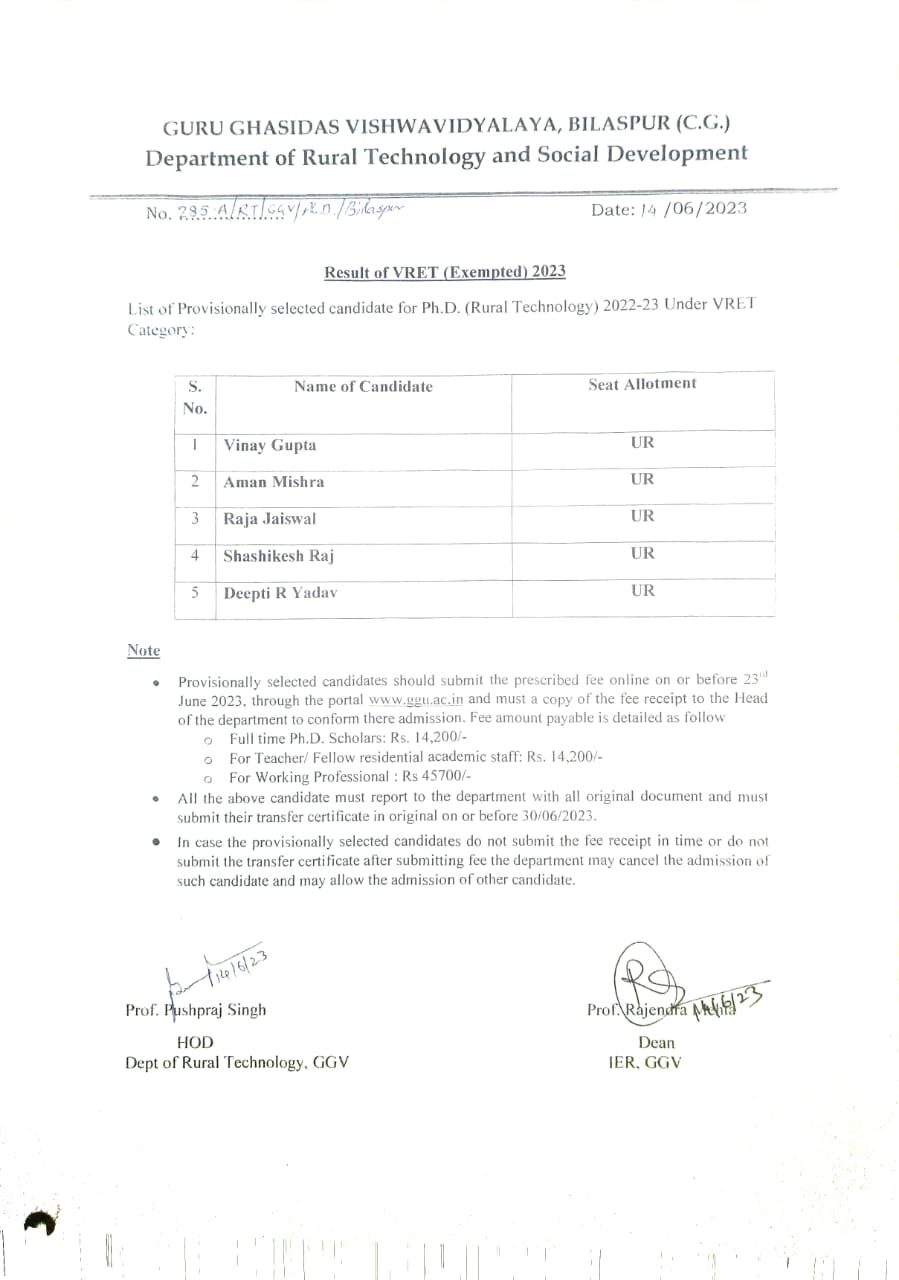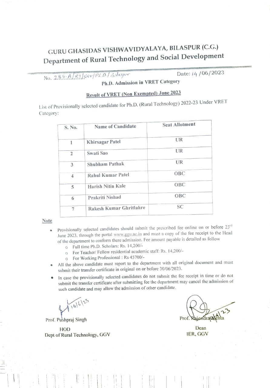 VRET - छूट प्राप्त श्रेणी के तहत पी.एच.डी. (ग्रामीण प्रौद्योगिकी) 2022-23 के लिए अनंतिम रूप से चयनित उम्मीदवारों की सूची
