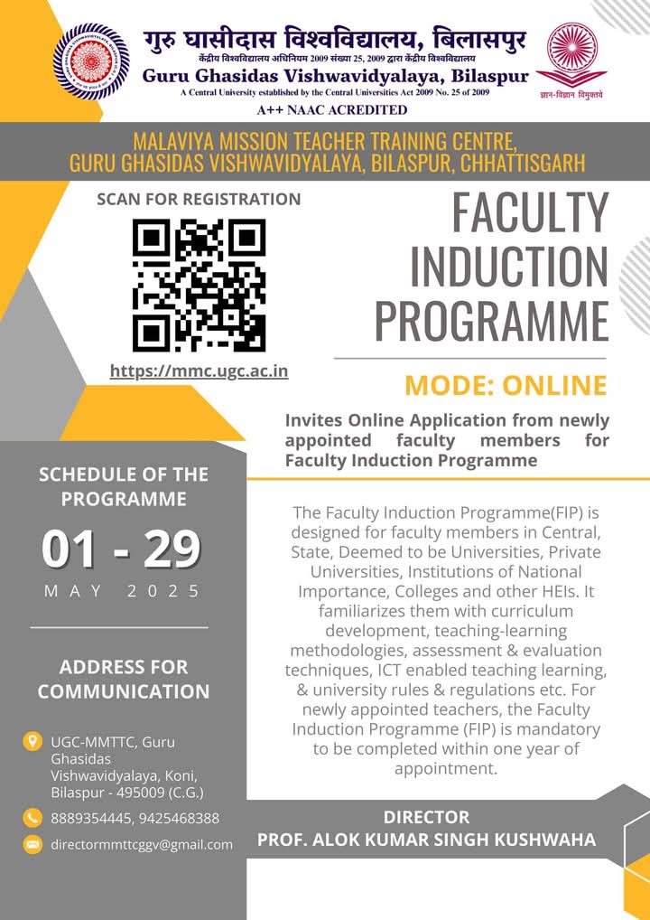 MMTTC-GGV (Malaviya Mission Teacher Training Centre, Guru Ghasidas Vishwavidyalaya, Bilaspur) invites online applications from newly appointed faculty members for the Faculty Induction Programme. The training will be held in offline mode from May 1 to May 29, 2025. This programme aims to equip new faculty with essential teaching, research, and academic administration skills.