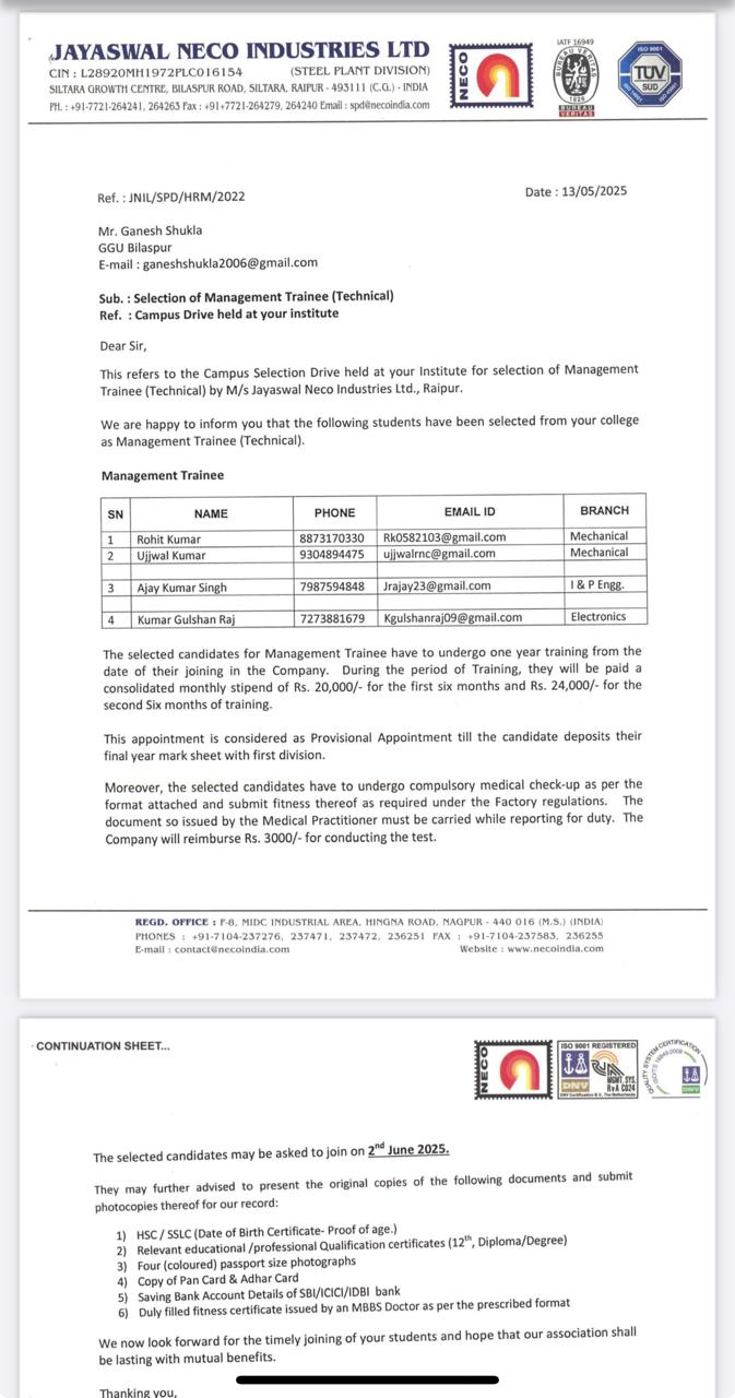 गुरु घासीदास विश्वविद्यालय,बिलासपुर | अभियांत्रिकी और प्रौद्योगिकी अध्ययन संकाय